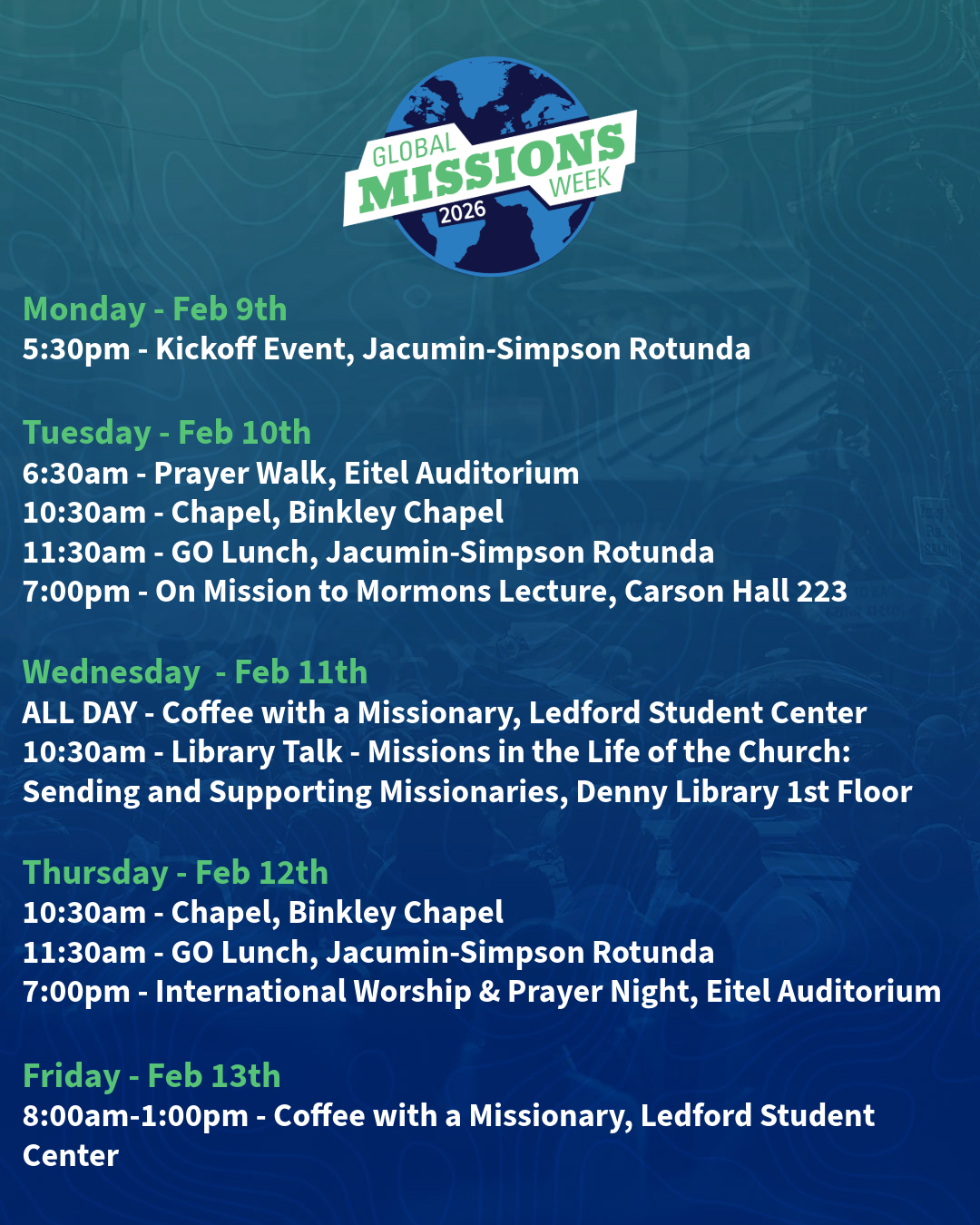 Monday: Global Missions Week Kick Off Dinner
